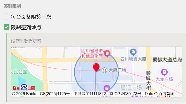 【企业版】用户可以在签到限制中开启“限制签到地点”。划定线下的可签到范围,用户在扫码签到时,需要授权获取设备定位,若定位失败/不在设定范围内,则无法完成签到,实现活动现场的“签到地理围栏”,保证所有签到真实发生在活动现场范围。