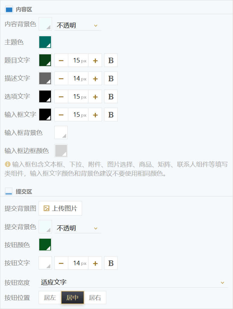 你可以调整内容区的背景色(支持调整透明度),内容区中所有组件的题目、描述文字、选项文字的字体样式(颜色、大小、加粗),以及各类“输入框”组件的文字样式、输入框的背景色和边框颜色(文本框、下拉框、商品选项等)。