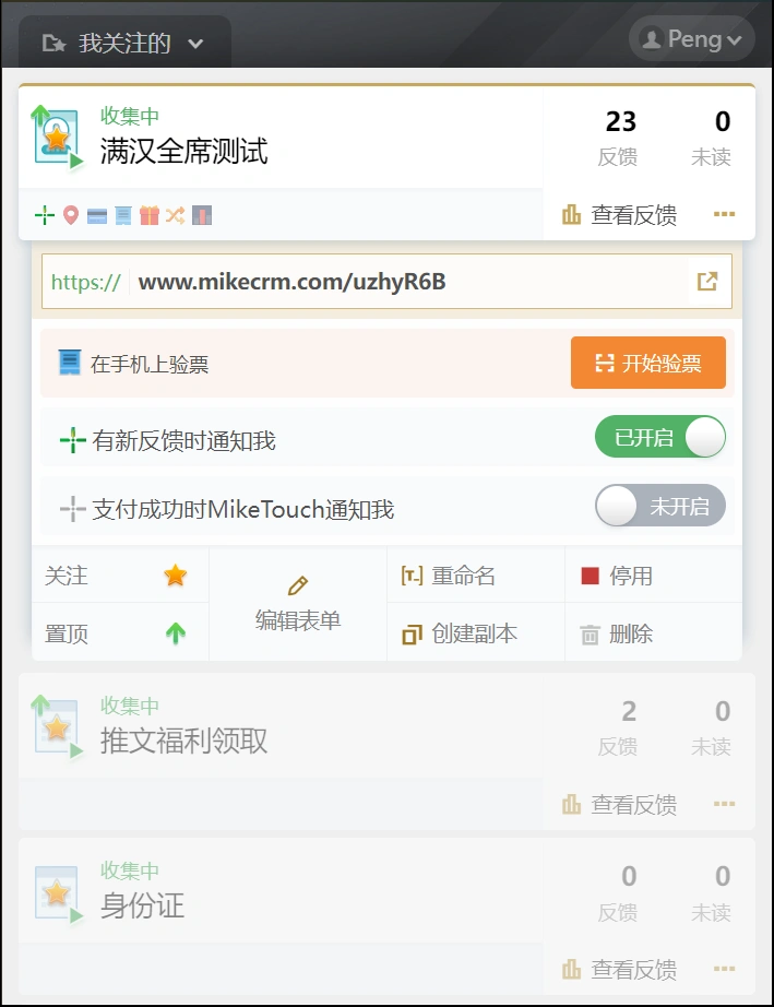- 反馈通知:快速开启/关闭当前表单的反馈通知提醒,通过MikeTouch稳定实时地接收提醒消息。