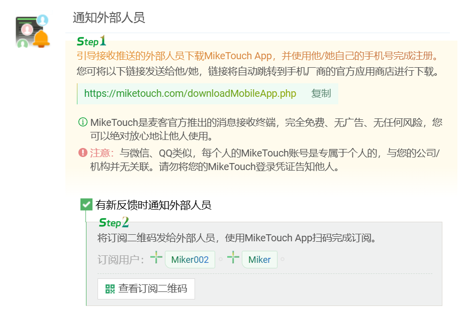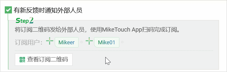 使用MikeTouch,不仅可以让制表人实时接收表单反馈提醒,还可以向外部人员推送反馈内容——只需让外部人员使用MikeTouch APP,扫描相应的订阅二维码即可完成配置(如何操作)。
