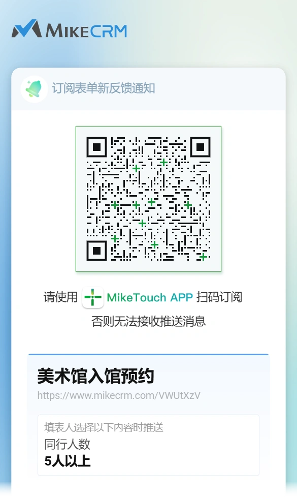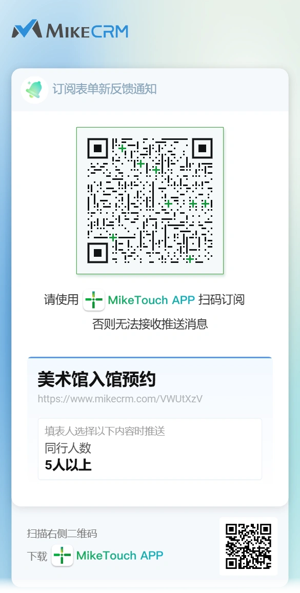 小编为您提供了一个“有新反馈时根据所选内容通知不同的人”的订阅二维码,欢迎您使用MikeTouch APP扫码订阅后,点击这里访问并提交示例表单,看看在“同行人数”这一题,选择“5人以上”才会接收推送提醒的实际演示效果吧~