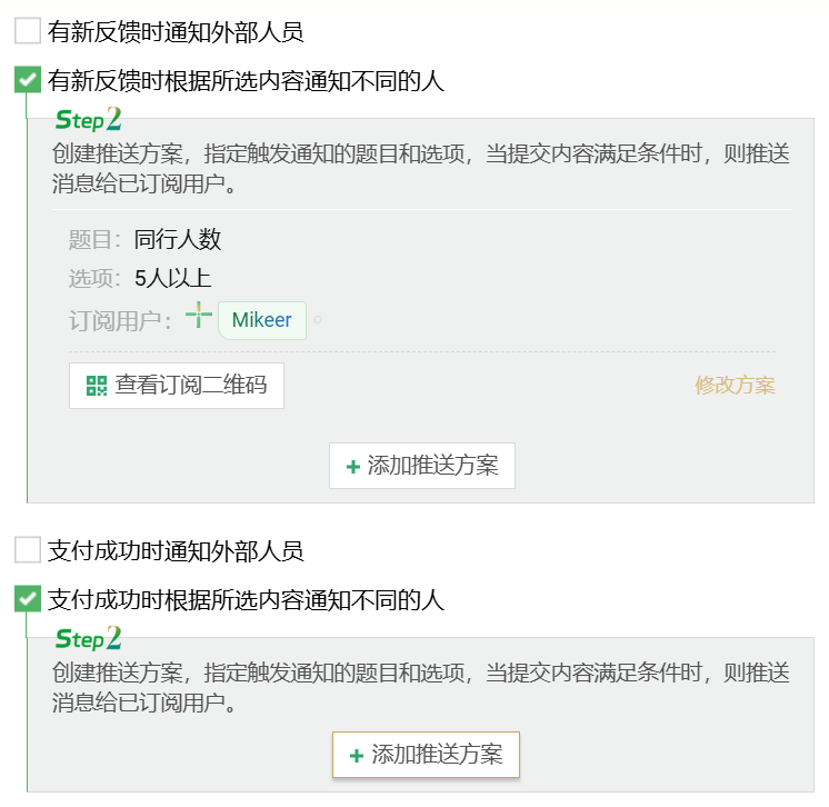 根据需要勾选启用某个通知设置项后,会在设置项下展示该配置下的专属订阅二维码订阅用户名单。“根据所选内容通知不同的人”的设置项启用后,还需要添加推送方案后才能获取方案对应的订阅二维码。