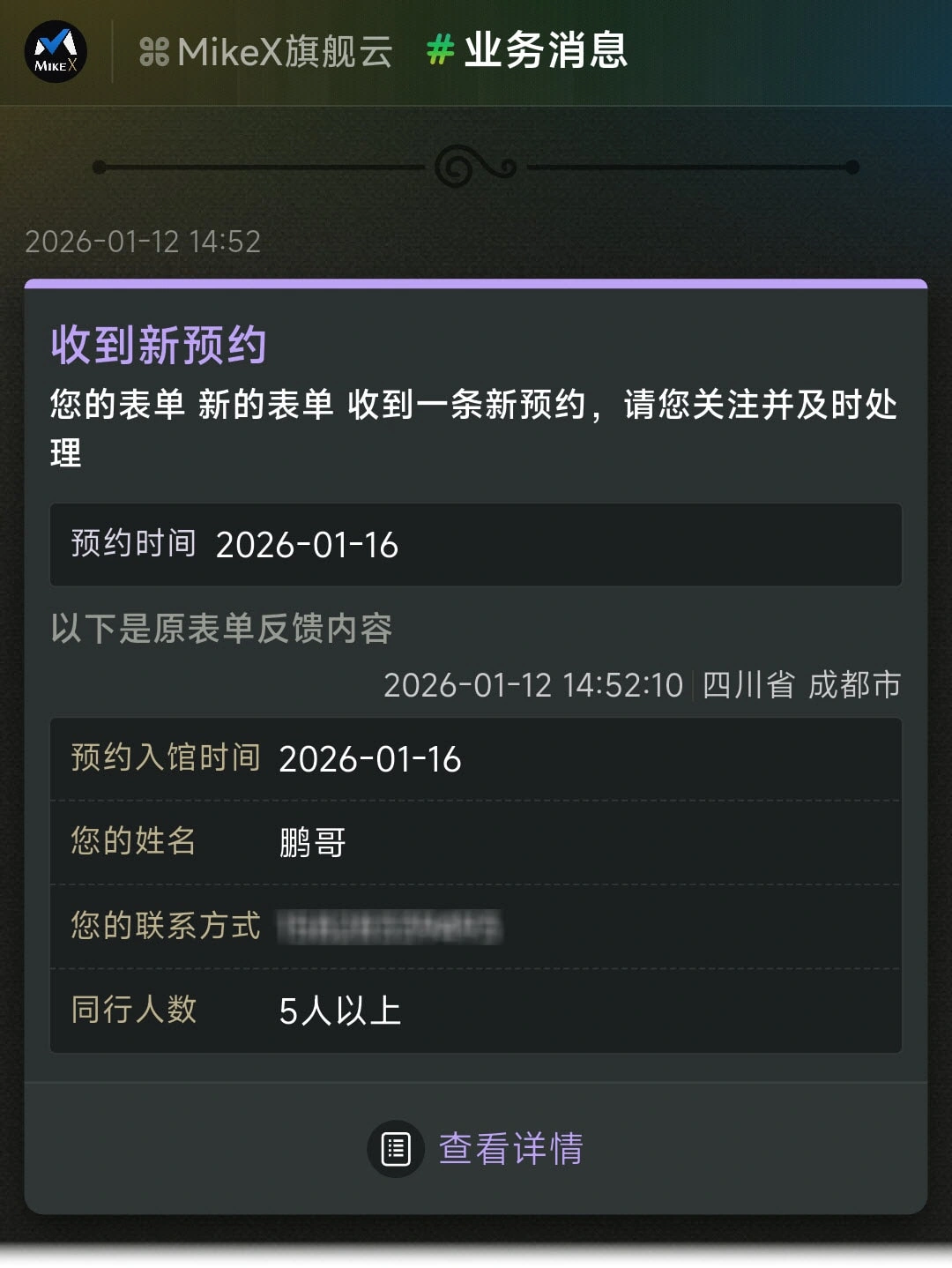 有新预约时通知:启用了“预约”功能的表单,有新预约时进行通知,通知消息中会重点凸显预约相关的信息;