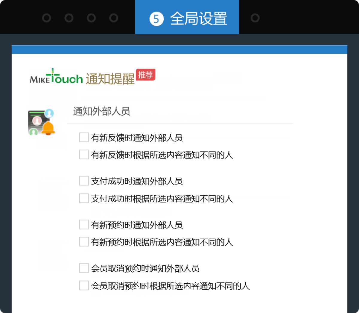 对需要推送反馈的表单进行编辑时,进入“全局设置-MikeTouch通知提醒”,就能找到“通知外部人员”的系列配置项了。