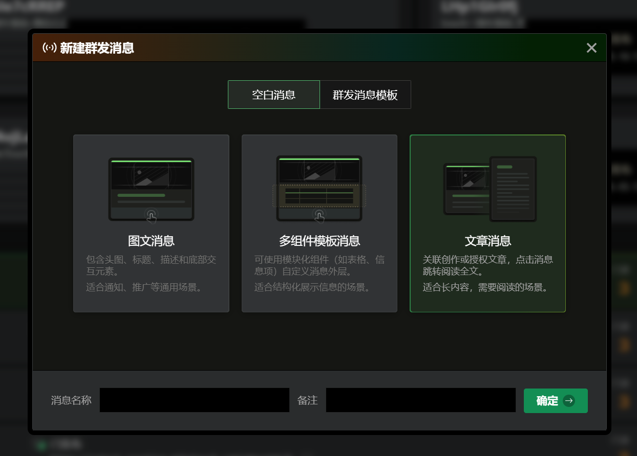 新建群发消息时选择“文章消息”类型,填写消息的名称和备注后,进行消息的编辑。