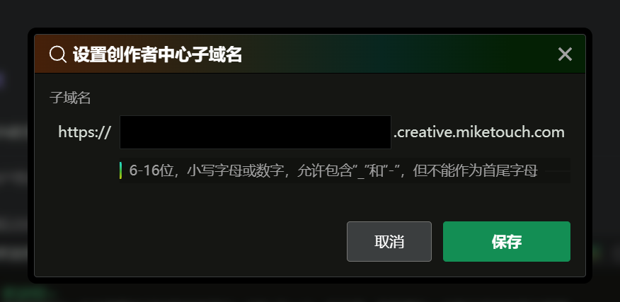 登录您的MikeTouch合作伙伴后台,进行入消息号设置页面的底部,可以设置“子域名”。子域名会公开展示,设置完成后不能修改,请谨慎设置合法、合规、合理的名称。