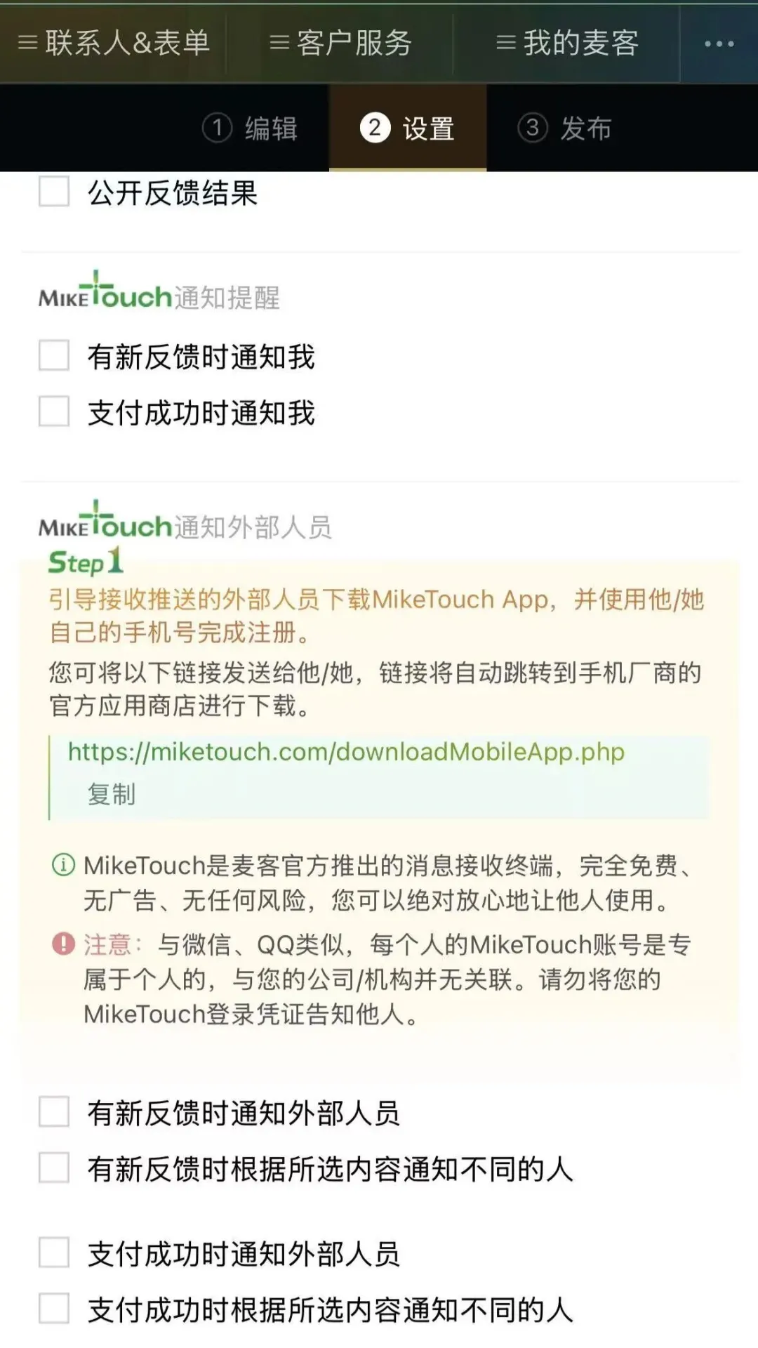 编辑需要推送反馈的表单,在「全局设置」→「MikeTouch 通知提醒」中,找到 “通知外部人员” 配置项,点击进入~